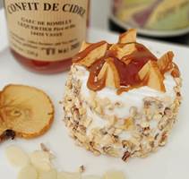 Fromage frais au lait cru d'environ 120g avec cœur d'amandes effilées et de confit de cidre (Domaine de Romilly/Vassy), enrobé d'éclats pralinés et saupoudré de chips de pomme et de caramel au beurre salé